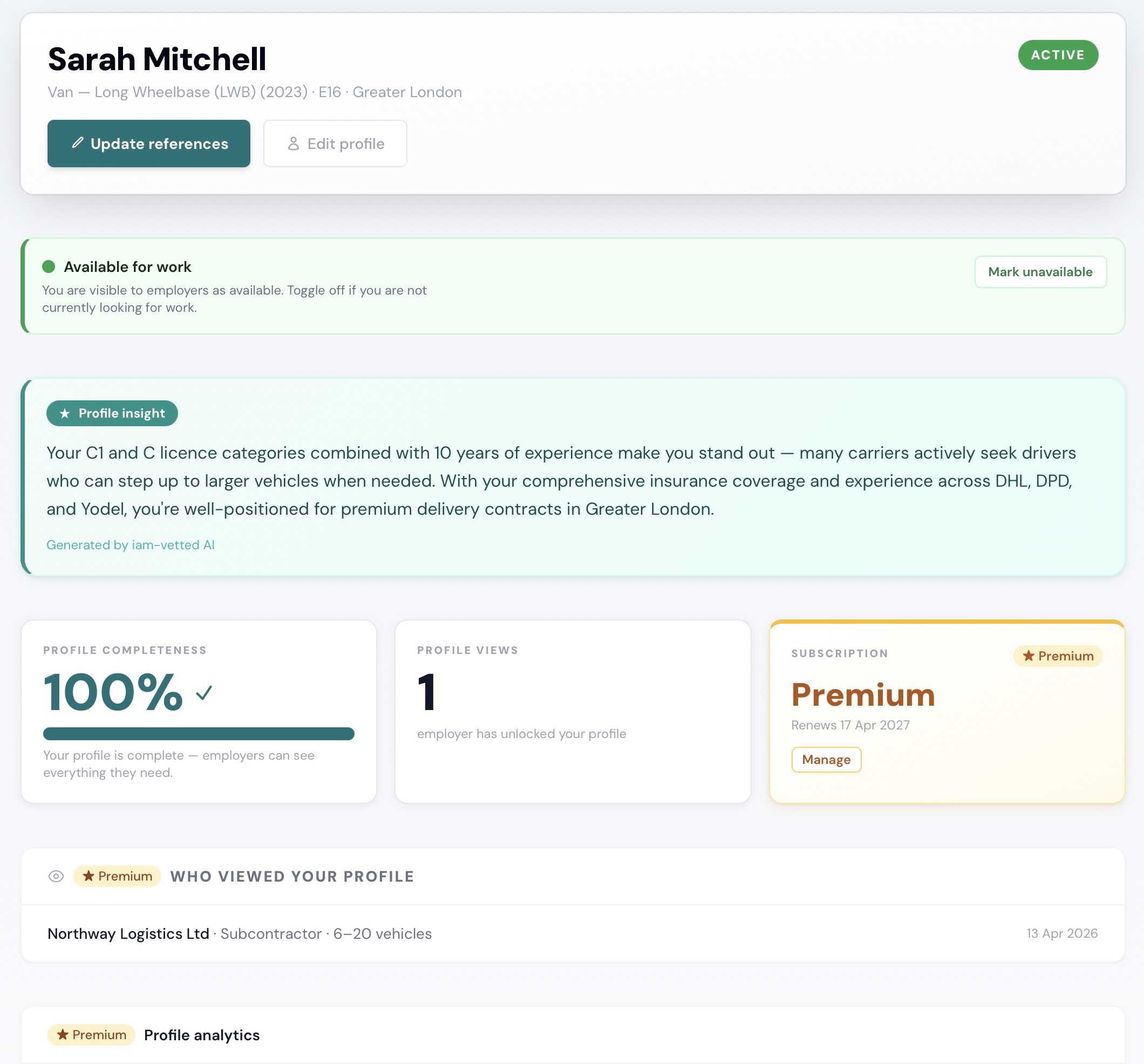 - AI-powered profile insights — personalised recommendations to help improve your profile